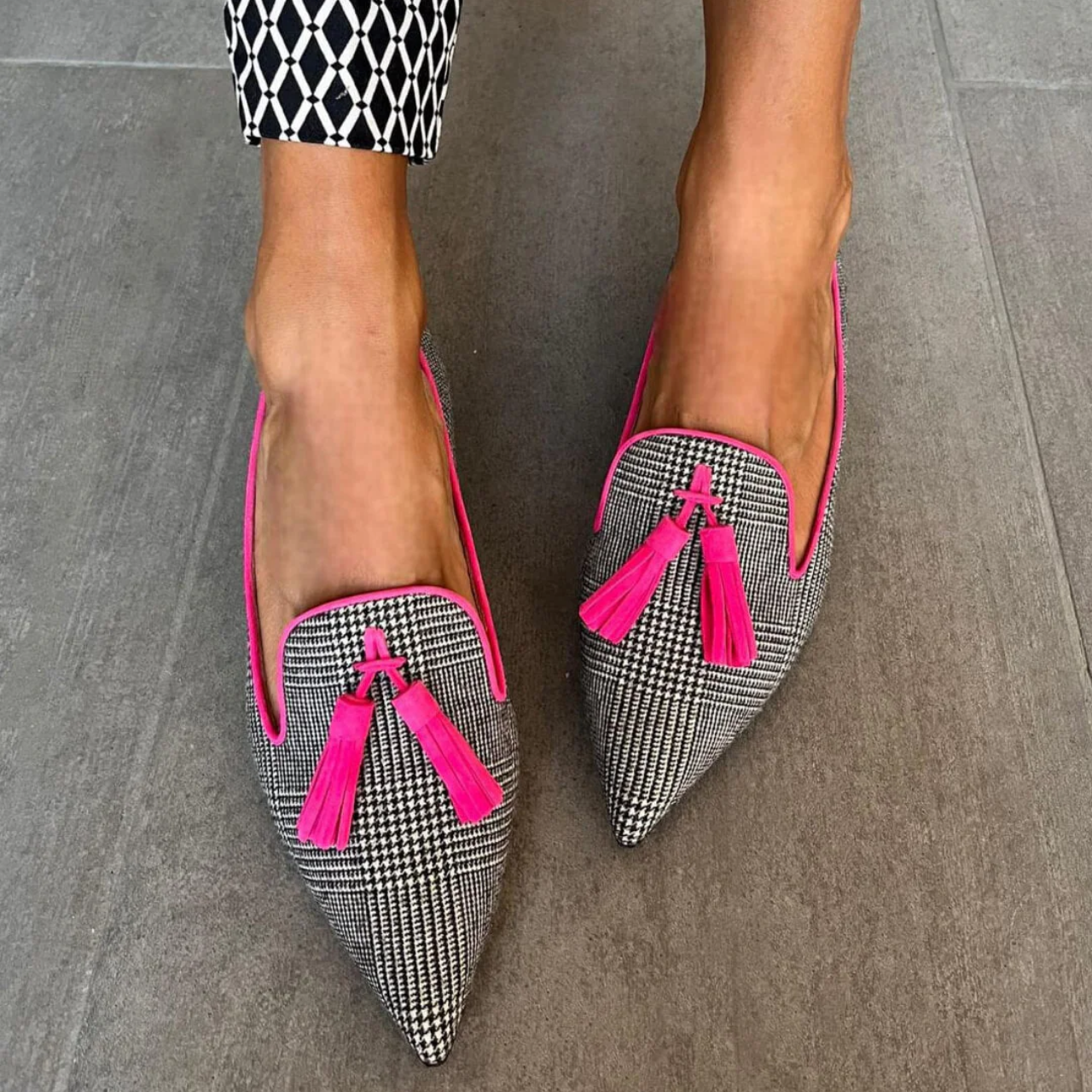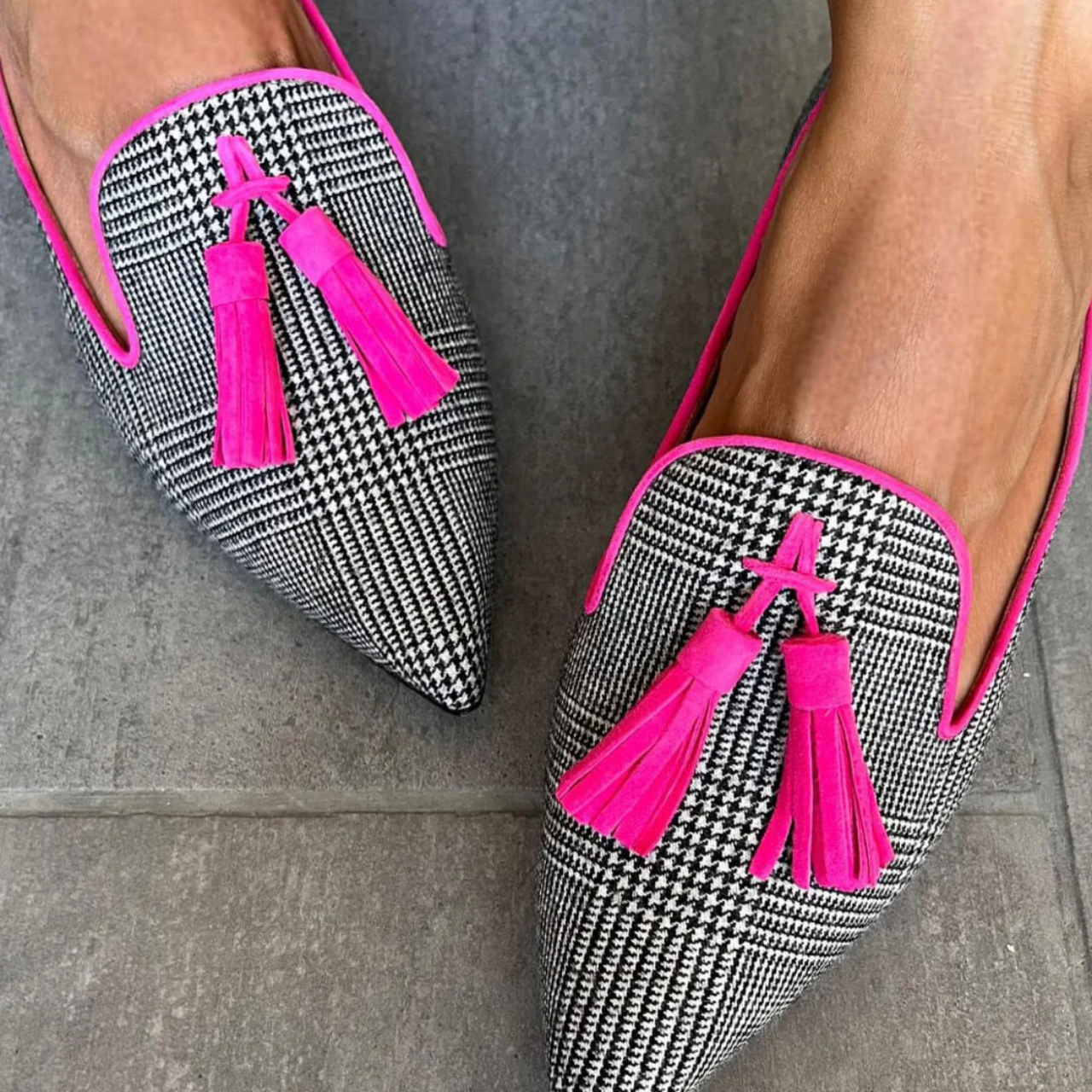 A sophisticated loafer design that combines a bespoke plaid pattern with vibrant fluorescent details. An original option for those who want to stand out with class.